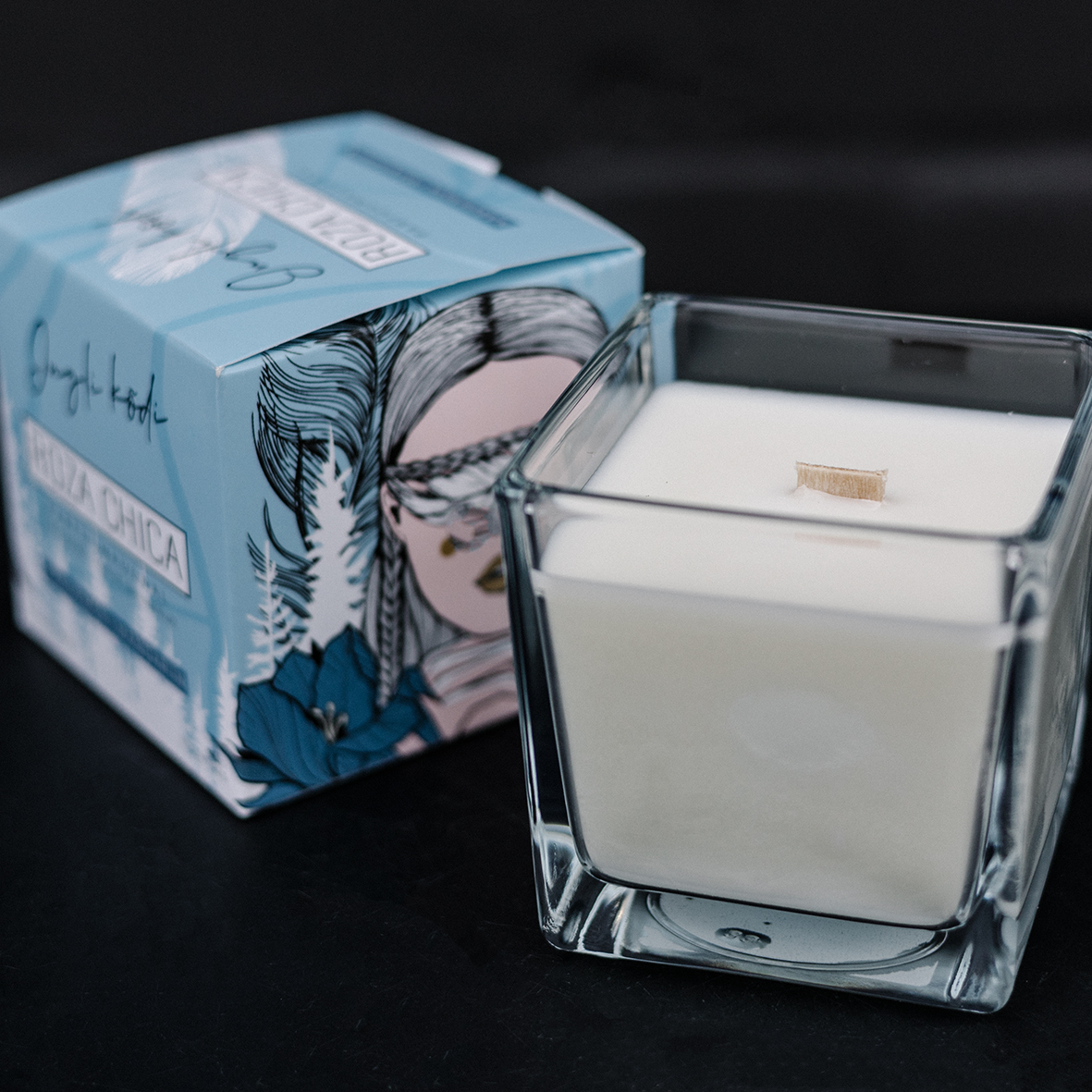 -Käsitsi valatud läbipaistvasse kandilisse klaasi, taimsest vahast ning puidust tahiga, mis põledes säriseb